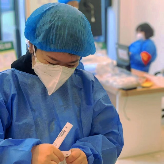 在做志愿者采集信息的当天,为了照顾上网课同学的时间,谭娅将原计划10:00开始的检测工作提前到8:00开始,因为穿了防护服一上午不能喝水不能上厕所,后背也全被汗水浸湿了,并且配合医务人员完成了859名住户核酸检测工作。